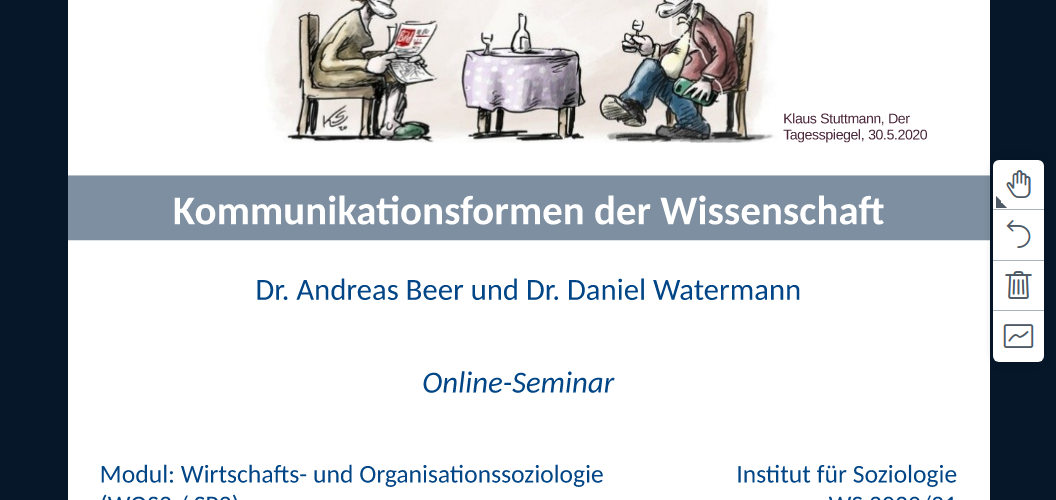 The introductory session went quite well, despite the fact that it’s the first online seminar I’ve ever given and the software (BigBlueButton) has its quirks. The participants are mostly students of sociology but there’s also one from ethnology, politics, arts and even one coming from American studies. All quite dedicated and maneuvering the pitfalls of an online seminar with us, the hosts.