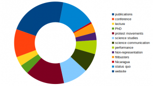 A second group is what I would call ‘research topics’, ie. the thematic areas I’ve covered over the years. In the chart, this group starts at the lower-left end with the already mentioned keyword ‘protest movements’, followed by ‘science studies’ (16) and ‘science communication’ (12). These two topics came up after I moved to the Institute for Higher Education Research and show that at least my research output has increased in the last six years. I guess that is due to the project-driven nature of research we do at the Institute. Other keywords in the group are ‘performance’ (9) and non-representation (5), which refer to my postdoc research topic. With together 15 mentionings, they make up less than half of the mentionings about research I’ve done at the Institute — a clear sign about the accelerated nature of research output there as I definitively haven’t done more original research there than during my postdoc phase. A final keyword of this group is ‘filibuster’, a nod to my PhD-topic. As this blog was started when that was already finished, the low number of only six mentionings (mostly connected to publications concerning this topic) seems logical.