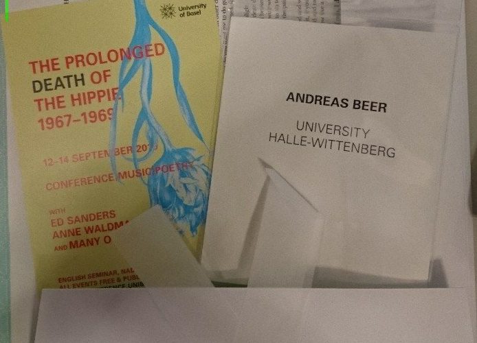 This time it is a conference which indeed would be shameful to not report on: “The Prolonged Death of the Hippie, 1967-69” at the University Basel (Switzerland), 12-14 September, 2019. Apart from the academic discussions, this was one of the best conferences I had the pleasure to attend thanks to its well-curated cultural programme. Not only did the city of Basel show off its best (extremely nice weather with possiblities of bathing in the Rhine) and the conference was small enough to really talk to and focus on all attendees, but the organisers also invited several people that had been active in the 1960s countercultural movement (how I prefer to call ‘the hippies’) and offered readings of poems and loads of anecdotes. Anne Waldman and Ed Sanders live on stage, so to say. It really showed that the organisers were personally interested in mixing first-hand experiences with reflections and analyses on those years (at least from the US; other regions were only marginally present, I noticed).The special spirit of the conference was exemplified by the inclusion of some cigarette papers in the conference folder (see above); unfortunately without any contents.